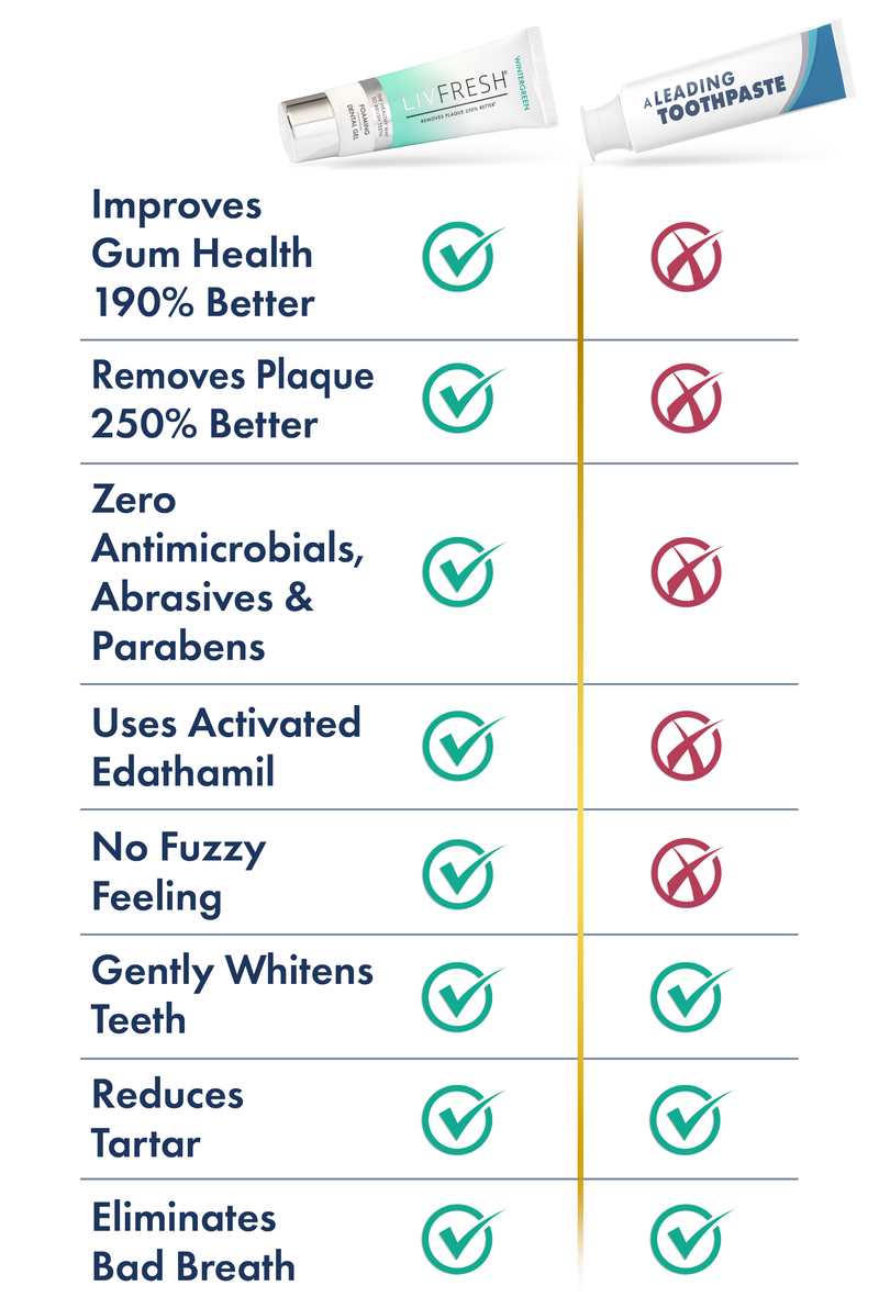 LivFresh is clinically proven to remove plaque 250% better, reduce tartar, eliminate morning breath, and reduce gum bleeding 190% more than leading brands. Our science is verified by 26 research studies at top US universities, 40 patents, & the United States Department of Defense.