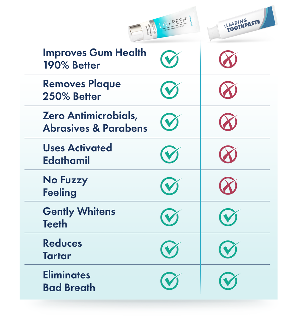 LivFresh is clinically proven to remove plaque 250% better, reduce tartar, eliminate morning breath, and reduce gum bleeding 190% more than leading brands. Our science is verified by 26 research studies at top US universities, 40 patents, & the United States Department of Defense.